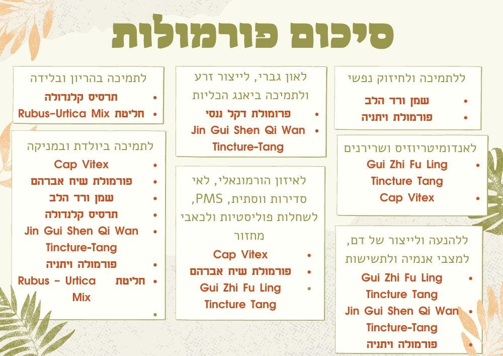 · פורמולה ויתניה– פורמולה שהיא מיועדת לתמיכה בנשים ובגברים אשר סובלים מתשישות, אנמיה ועייפות כרונית. הפורמולה תומכת בהנעה ובבנייה של דם, מאתנת עצבית ומסייעת לאיזון כללי פיזי ונפשי.